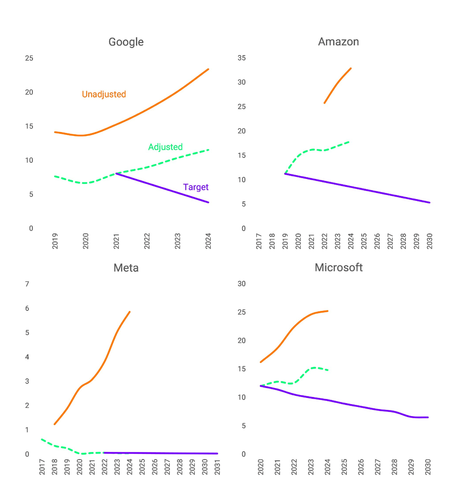These charts from the 2026 report, “The AI Climate Hoax,” show compiled emissions data for four major tech companies compared to the trajectory of targets they set in recent years.