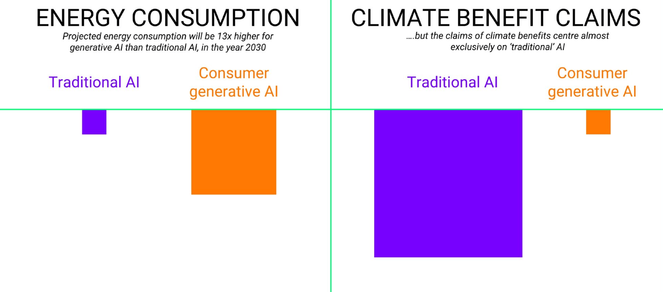 Graphic from the 2026 report, “The AI Climate Hoax,” illustrating how “consumer generative AI” (eg ChatGPT) requires significantly more energy than “traditional AI” (eg predictive machine learning systems).