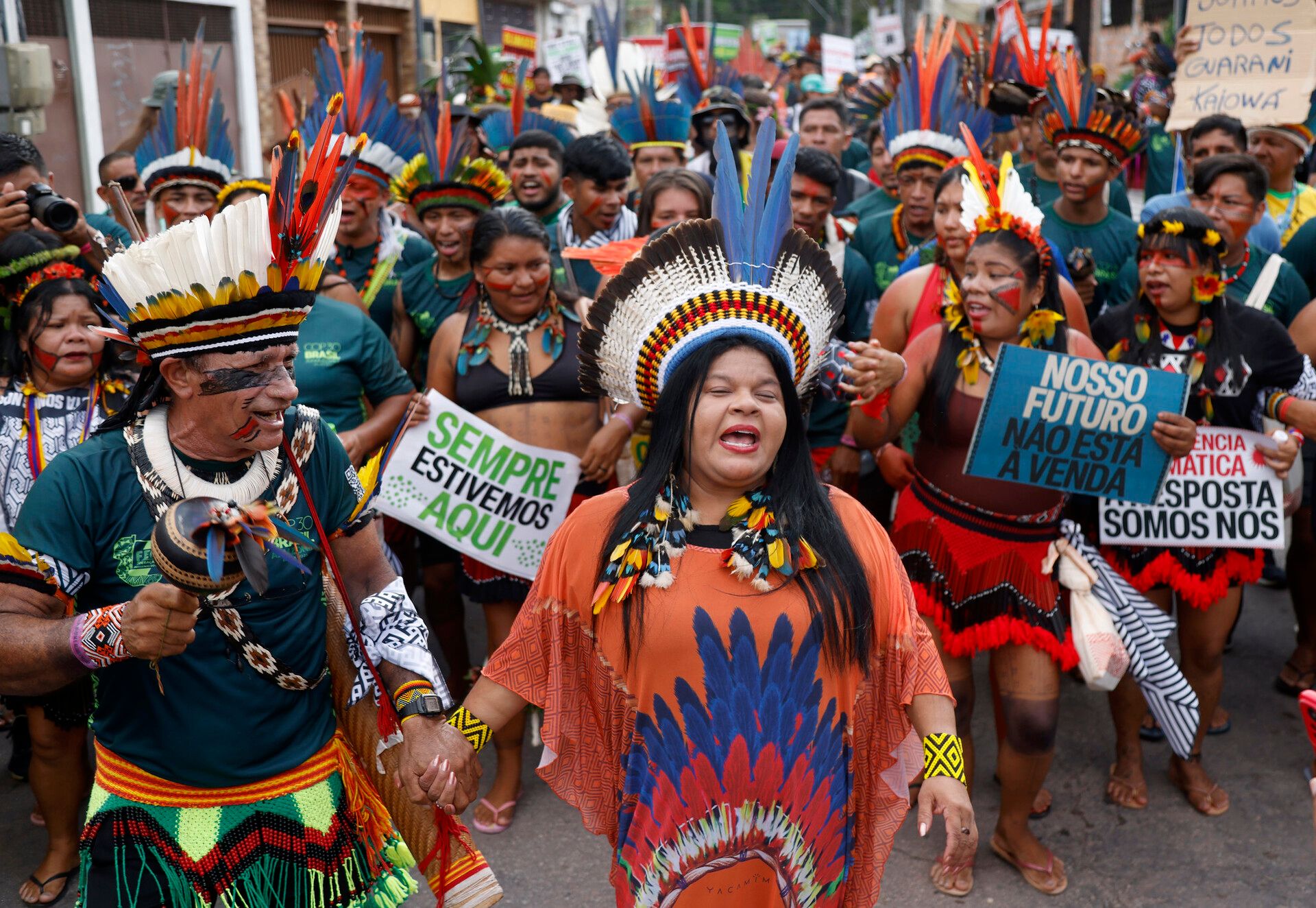 Sonia Guajajara, minister for Indigenous Peoples of Brazil, at the global march for The Answer is Us campaign, which calls for unity in finding solutions to the climate crisis. Image by Hermes Caruzo from COP30.